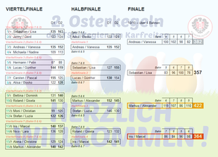 Wie immer bei solchen Veranstaltungen bot die Auslosung vor dem Turnier besondere Spannung. Dass es auch diesmal Favoriten gab hat sich jeder selbst zu verdanken, denn die Startnummer wurde von jedem selbst gezogen. Mit 422 Kegel siegte das Doppel Markus & Alexander deutlich vor Andreas & Vanessa.