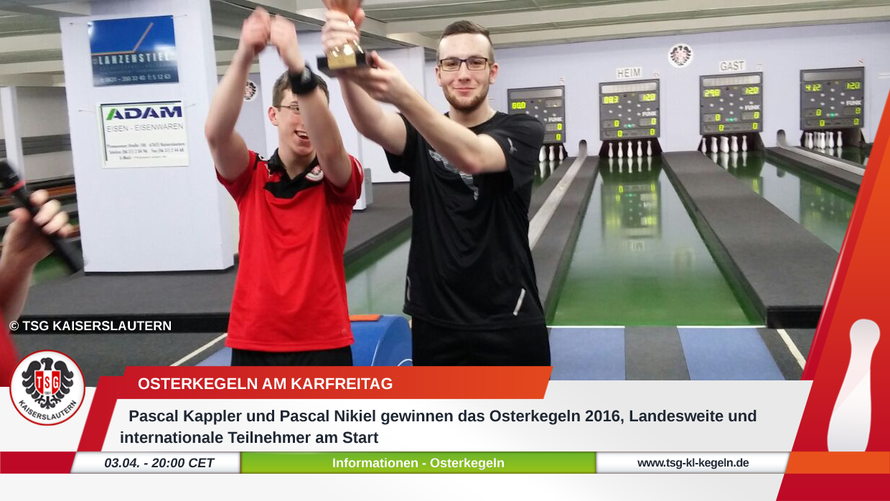 Auch in diesem Jahr fand am Karfreitag das Osterkegeln der TSGler statt. Diesmal mit einer Gruppenphase und den Finalspielen, meldeten sich 24 Teilnehmer die als Paare für den Wettbewerb zugelost wurden.