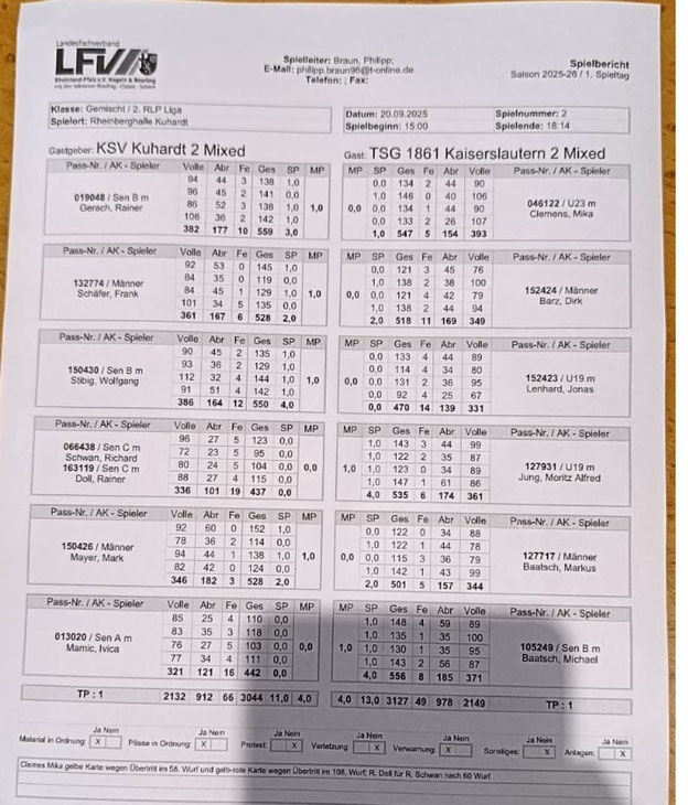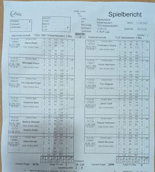 0:3 und 59 Holz miesen griffen nun Pascal Nikiel und Benjamin Wagner zur Kugel. Während nach der dritten Bahn kurz ein Unentschieden in greifbarer Reichweite war reichte es am Ende leider nicht. So sicherte sich Philipp Braun mit 603:552 3:1 gegen Benjamin seinen Punkt. Den zweiten Punkt für die Lautrer konnte sich Pascal mit 2,5:1,5 SP und 599:552 gegen Patrick Jochem sichern.