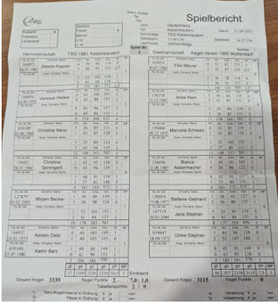 Mit einem deutlichen 7:1 (16,5:7,5, 3339:3115) gelang der Frauenmannschaft der fast perfekte Start. Zu Beginn konnte Alessia Kappler erst im 4. Satz das Duell entscheiden und dank den überragenden 622 Kegel von Vanessa Welker (4:0) wurde ein 2:0/+157 Vorsprung übergeben.