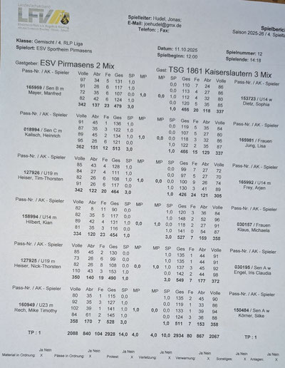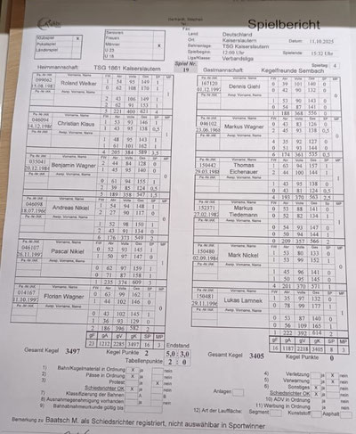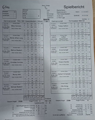 Das Spiel endete mit 3310:3300 Kegeln und 5:3 Punkten zu Gunsten der TSG Kaiserslautern 2 Mixed.