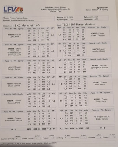 So blieb es, am Ende bei einem dem Spielverlauf, entsprechenden Heimsieg für die TSG mit 5:3 und 3497:3405. Nach einem spielfreien Wochenende erwarten die Lautrer dann das Team der KV Mutterstadt zum Duell der ehemaligen Bundesligisten auf den Bahnen im Buchenloch.